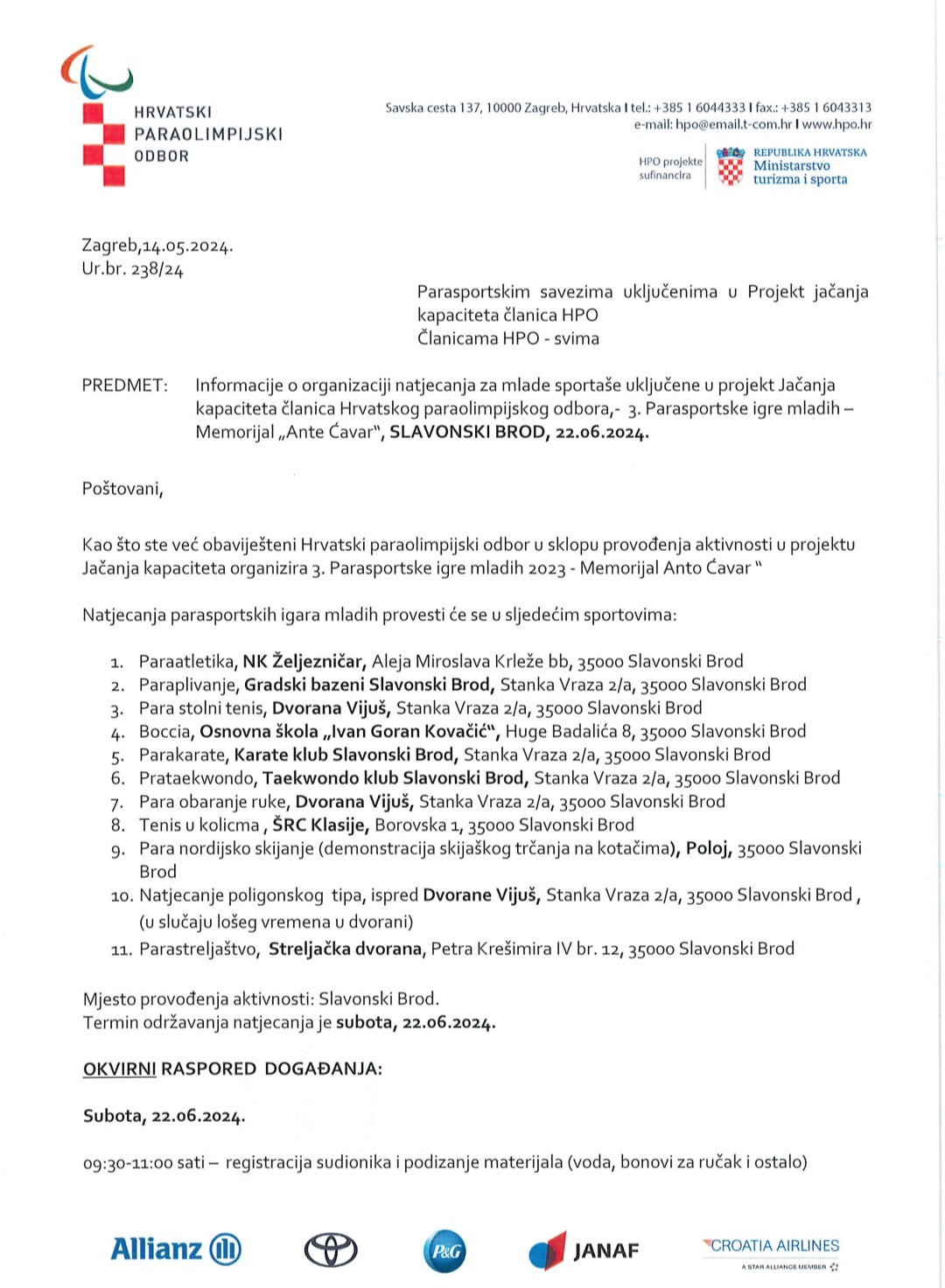 Pozivaju se članovi Parasportskih saveza i klubova, predstavnike HPO-a te prijatelje sporta da se odazovu ovom događaju i dođu u što većem broju podržati svoje natjecatelje. Parasportske igre mladih održati će se u Slavonskom Brodu 22.6.2024. god. sa početkom u 10:30 h ujutro, a otvorenje će biti na umjetnoj travi nogometnog terena kod dvorane Vijuš.