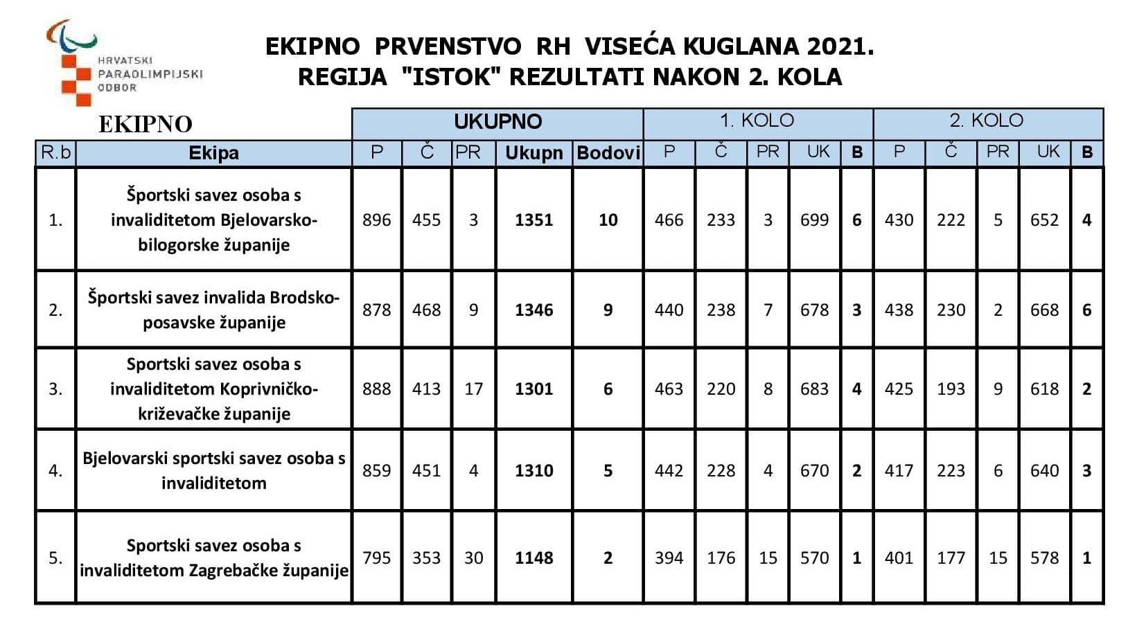 vodeći po broju srušenih čunjeva je Športski savez osoba s invaliditetom Bjelovarsko-bilogorske županije, slijede Športski savez invalida Brodsko-posavske županije, Sportski savez osoba s invaliditetom Koprivničko-križevačke županije, Bjelovarski sportski savez osoba s invaliditetom, Sportski savez osoba s invaliditetom Zagrebačke županije.
